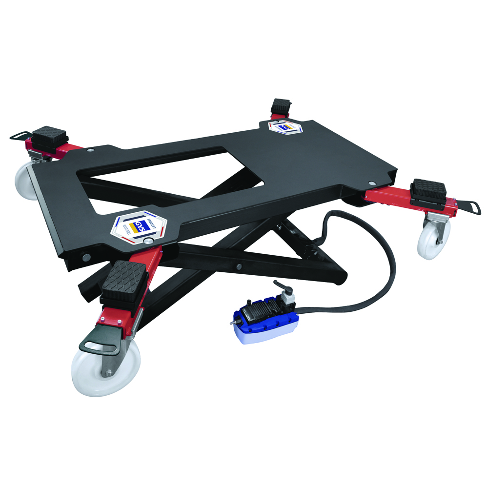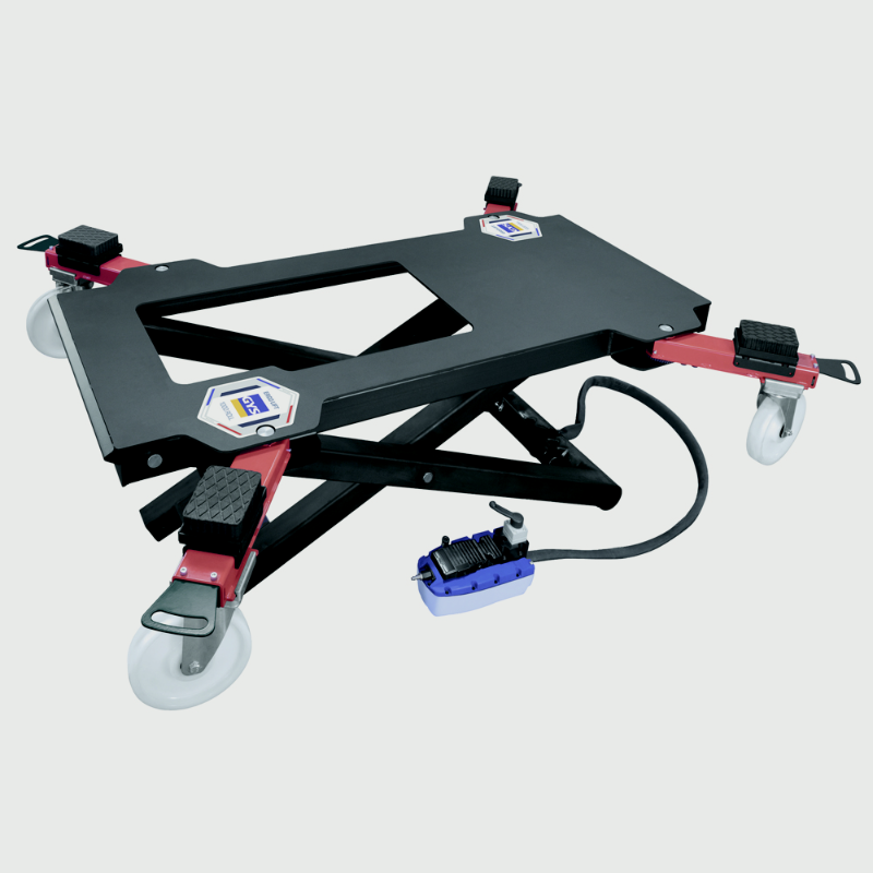 The ERGO LIFT 1000 ROLL is capable of lifting and moving a 2.5 T vehicle, and operates solely on compressed air. The 4 support arms automatically lock, and are adjustable to adapt to all different types of chassis. With a lifting height of 95 cm, the user can work standing up, which reduces fatigue.