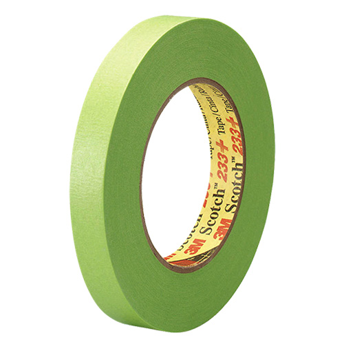 Scotch® Performance Green Masking Tape 233+ delivers consistently superior performance on moldings, plastic, glass, metal, rubber and paint. Balanced four-part construction includes flexible backing that applies easily around vehicle curves and contours and our patented adhesive that sticks at a touch, stays put and removes without transfer for consistently outstanding paint lines.