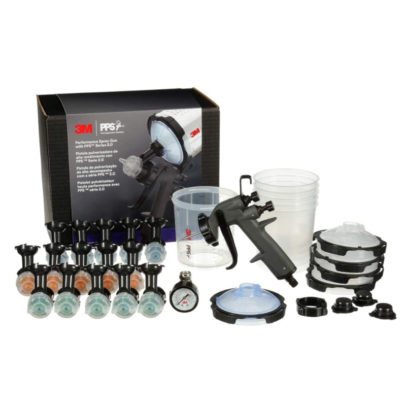 KIT INCLUDES: 1 Spray Gun, 15 Gravity HVLP Atomizing Heads, 3M PPS Series 2.0 Spray Cup with 5 lids and liners