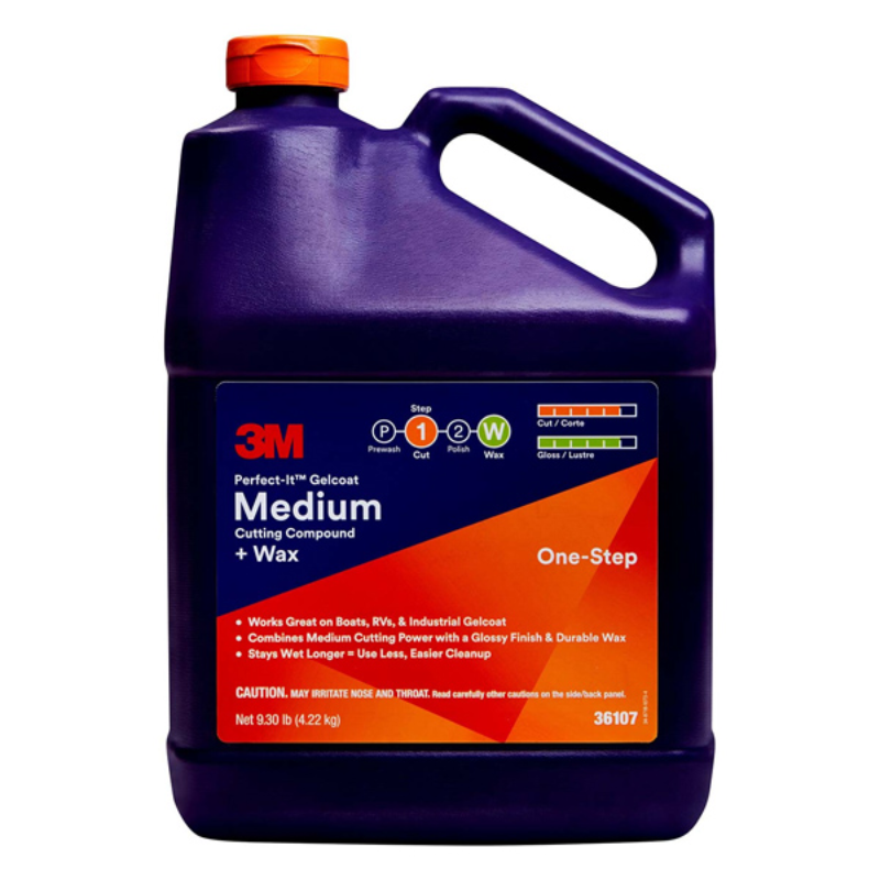 3M™ Perfect-it™ Gelcoat Medium Cutting Compound+Wax is 3M's best one-step solution for major gel coat refinishing. It quickly removes major defects (scratches, oxidation, chalking, watermarks). It also provides a durable protective wax with a high gloss. 3M™ Perfect-It™ Gelcoat Medium Cutting Compound + Wax combines fast cutting power, a high gloss finish, and durable wax protection. Use this for any P1000 and finer scratches. Its improved formula has longer wet times for easier clean up and less dust, even in warm climates.