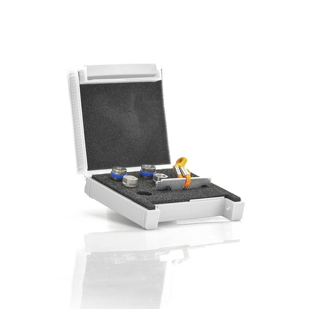 Screw the riveting tool needed for the working process into a holder in the rivet clamp as required. Hand-tighten the riveting head using the special spanners provided. Counterhold the nut using a screwdriver if necessary. Screw the corresponding counterpart to the rivet insert into the opposite side of the rivet clamp (plunger rod) with the spacing bushing and bolt, and hand-tighten.