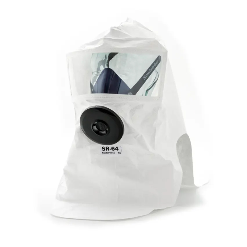 The SR 64 protective hood is designed for use together with Sundström half masks and full face masks with filters or the SR 307 compressed air attachment, and with the SR 90 Airline. The hood provides protection against dust and particles, and against a minor amount of splashing and dripping. The SR 64 is made of non-woven material (Tyvek®) and can be used in any situation in which a half mask can be employed. However, the hood does not provide protection against toxic, aggressive or irritating vapours or aerosols. The hood is intended for short-time use and is not suitable for cleaning.