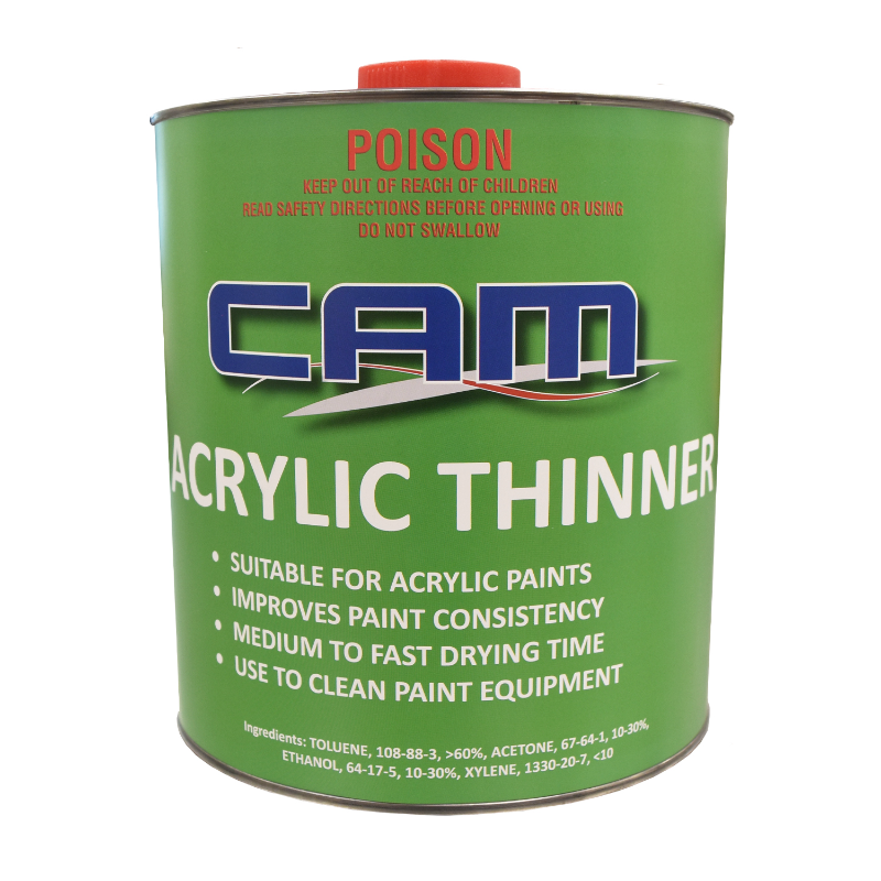 CAM Acrylic Thinner is a high-quality thinner suitable for automotive acrylic paints. It has a high gloss finish and is used to level out the paint, having a medium to fast drying time. It is suitable to clean up both enamel and acrylic paint/primers from brushes and spray equipment.