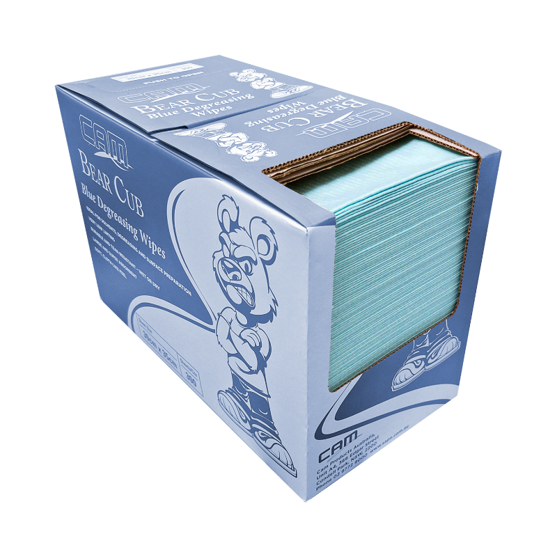 CAM BEAR BLUE Degreasing Wipes are lightweight yet exceptionally strong surface-preparation wipes designed for high-performance cleaning and degreasing. Highly absorbent and low-linting, they pair effortlessly with a wide range of cleaning agents, making them ideal for demanding applications.
