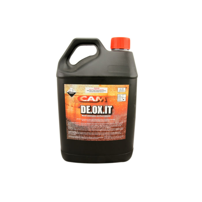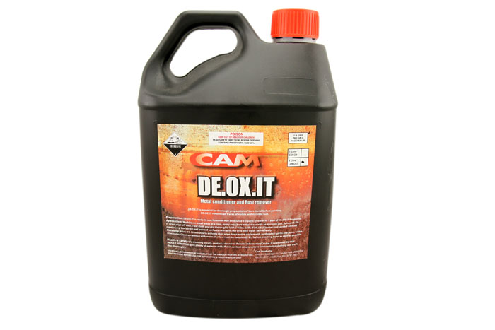 Working on small areas at a time, apply onto bare metal areas with an abrasive pad. Before DE.OX.IT dries, wipe off with a wet cloth and dry thoroughly with a clean cloth. If DE.OX.IT comes into contact with old repairs ( e.g. bodyfiller) and painted surfaces neutralise the area with water immediately.