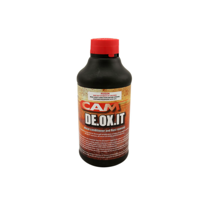 Working on small areas at a time, apply onto bare metal areas with an abrasive pad. Before DE.OX.IT dries, wipe off with a wet cloth and dry thoroughly with a clean cloth. If DE.OX.IT comes into contact with old repairs ( e.g. bodyfiller) and painted surfaces neutralise the area with water immediately.