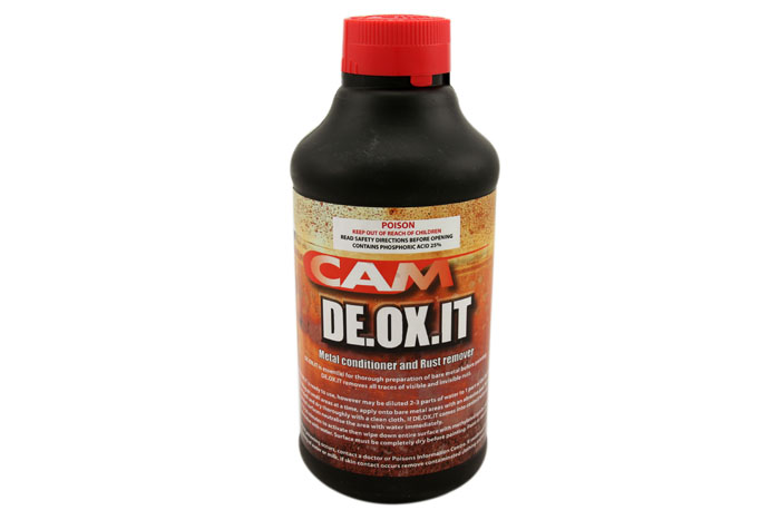 Working on small areas at a time, apply onto bare metal areas with an abrasive pad. Before DE.OX.IT dries, wipe off with a wet cloth and dry thoroughly with a clean cloth. If DE.OX.IT comes into contact with old repairs ( e.g. bodyfiller) and painted surfaces neutralise the area with water immediately.