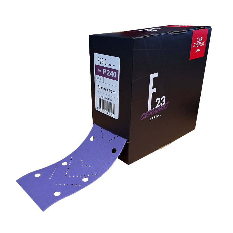 The new ceramic sanding strips F.23 C from Carsystem resharpen during the sanding process and are durable regardless of the sanding pressure. A stearate coating reduces dust formation and prevents the abrasive from clogging during sanding. The F.23 C strips from Carsystem are perforated and can therefore be customised for the respective sanding process.