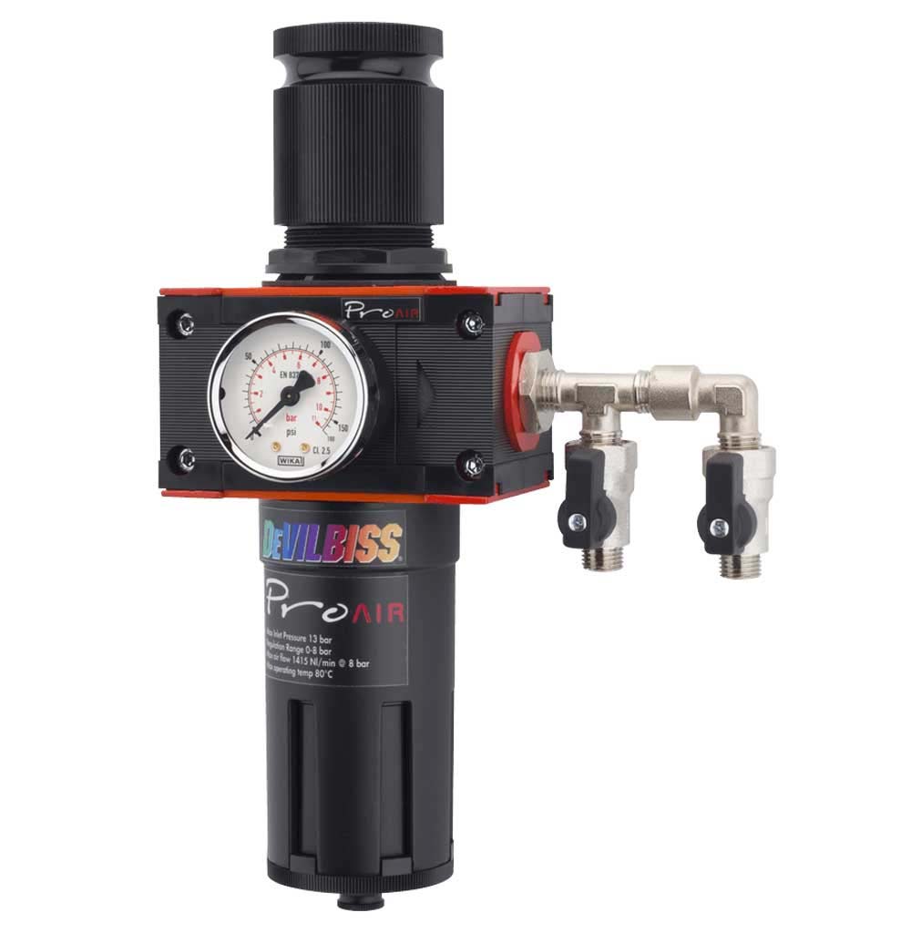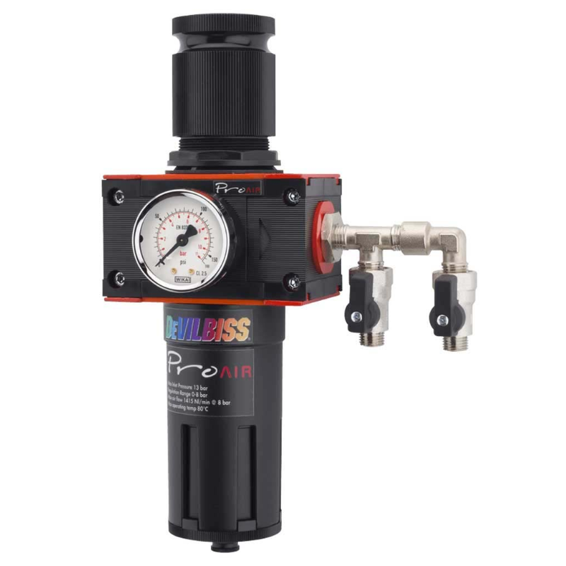 DeVilbiss Pro Air 1 Filter Regulator Dual filtration eliminates dirt down to 5 microns from reaching the spray gun and like all ProAIR filter regulators, condensate can be removed from the filter bowl manually or semiautomatically on depressurisation of the system. Ideal for running a spray gun (not suitable for breathing air).