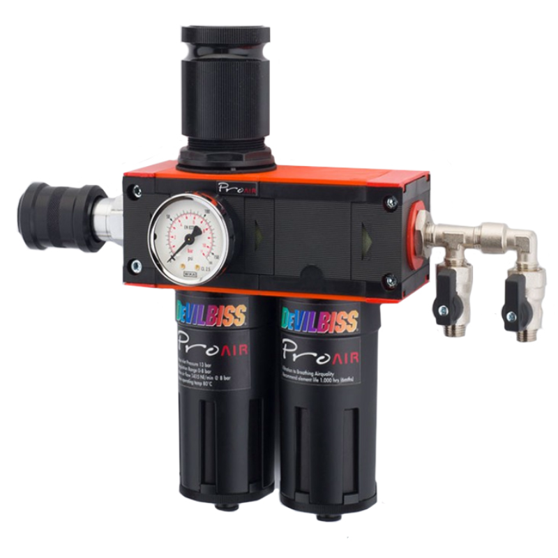 DEVILBISS Filter Regulator PROAIR-2. High air flows for conventional and compliant spray guns. Provides air filtered to 0.01 microns suitable for air-fed respiratory outfits. Maximum airflow of 3500 l/min (124cfm) Suitable for use in booth/oven up to 100°C (212°F). Three ball valve controlled outlets. Rolling diaphragm gives rapid response and sensitive air pressure control.