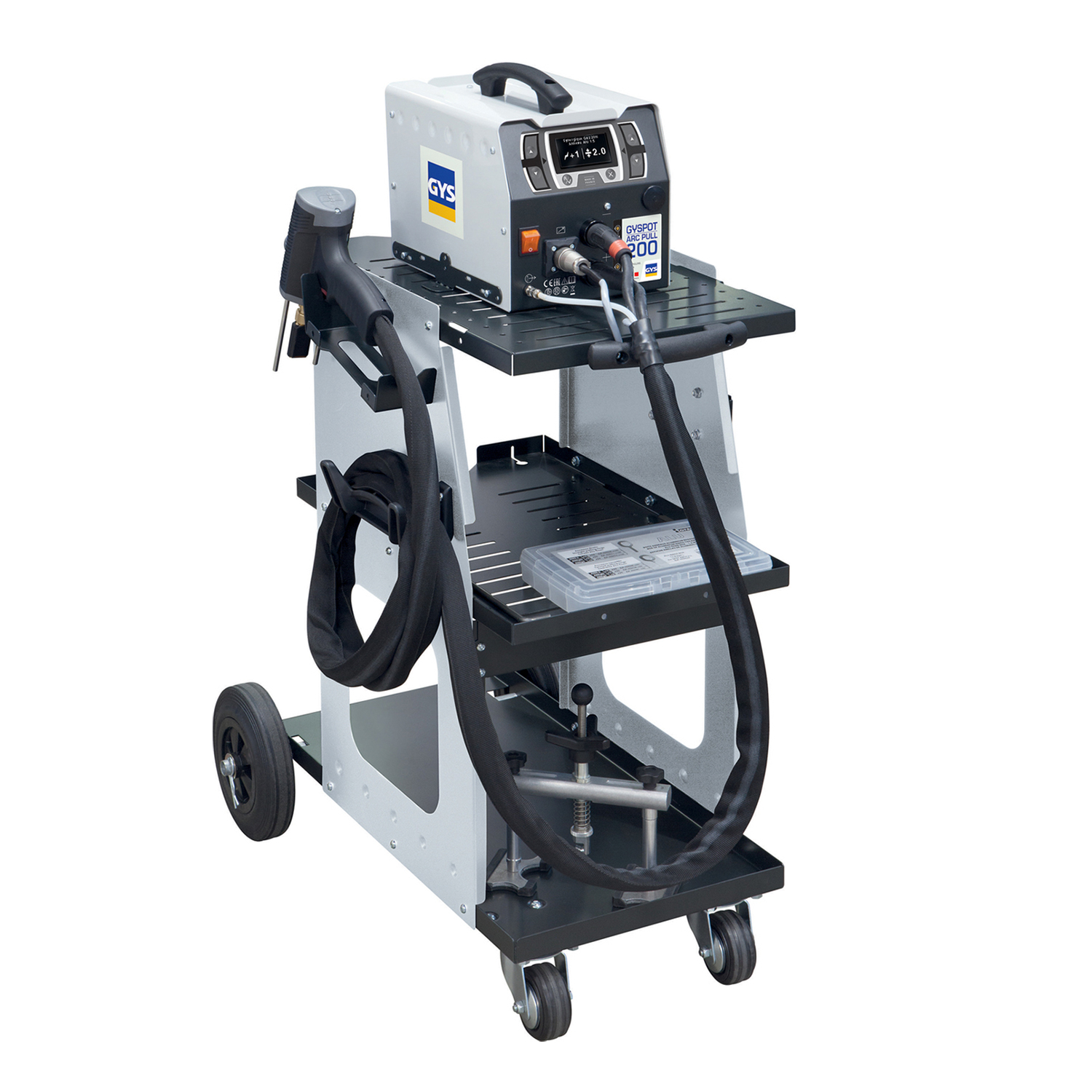 GYSPOT ARCPULL 200 is a drawn arc welding product developped specially for carbody thin sheets. Its innovative gun is equipped with a high precision linear motor with digital control, which provides refined synergies.