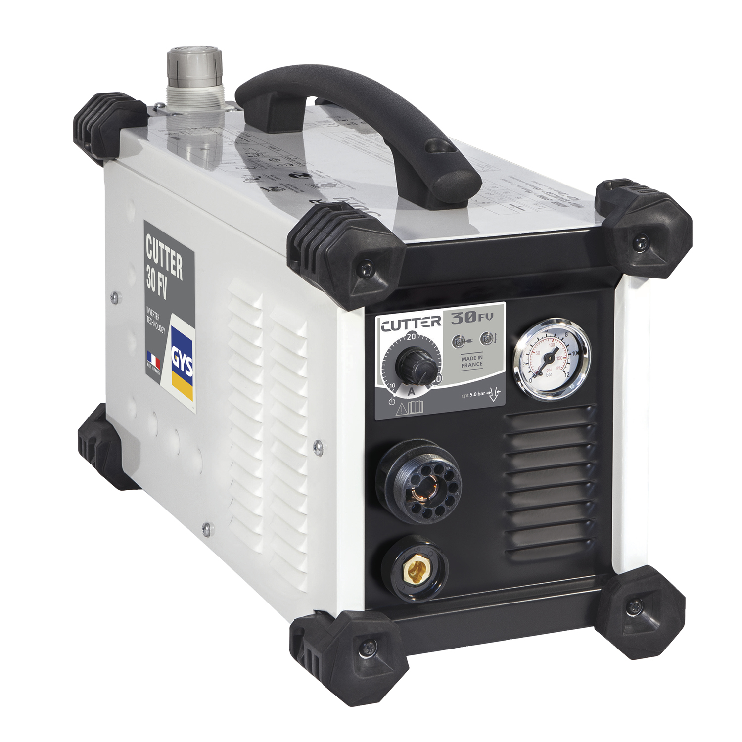 The CUTTER 30FV is a 30A plasma cutter with a cutting capacity of 10mm thick for steel (severance cut up to 15mm). The HF-free arcing system preserves and increases the consumables' life span. Designed for maintenance jobs and car body repairs, it integrates robust mechanical parts along with an intuitive interface and flowmeter on the front panel.