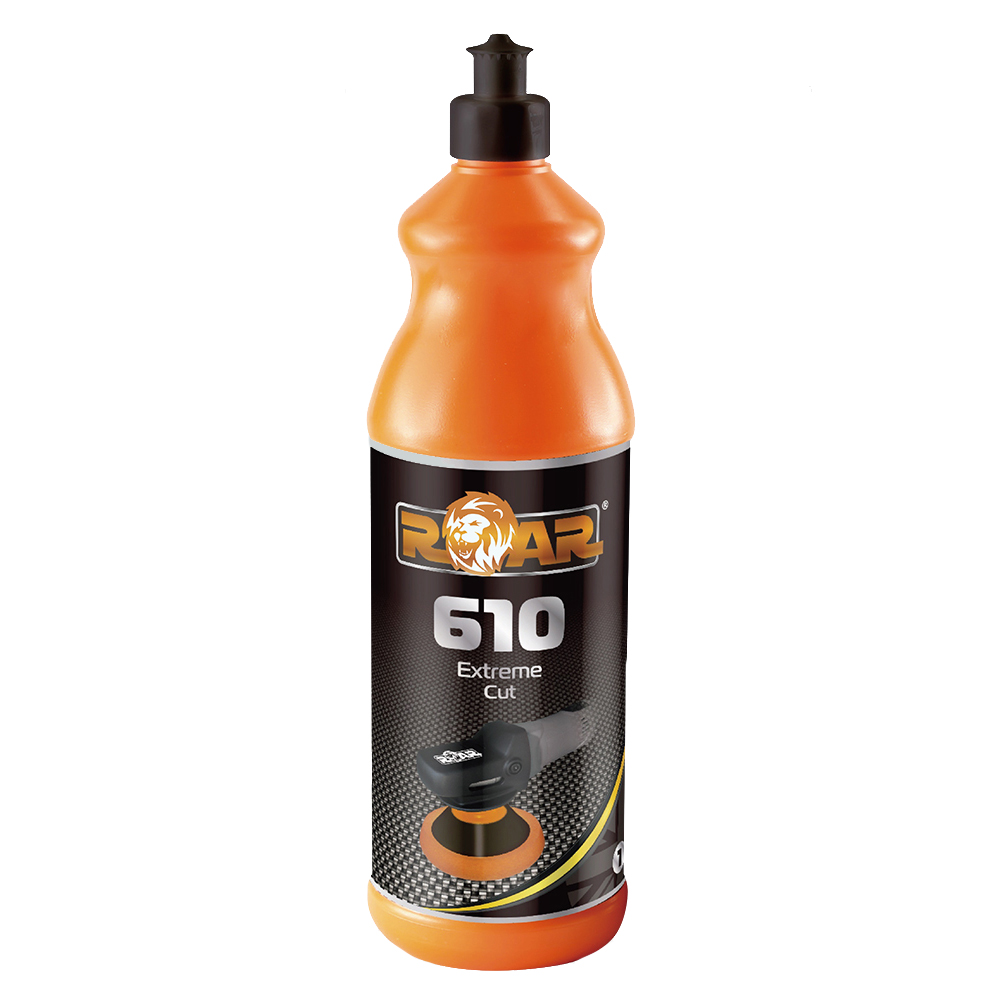 ROAR 610 is a versatile all in one compound that minimizes process speed by completing both the cutting and polishing steps with one product. 610 provides a fast cutting action to easily remove P1500 (or finer) sanding cards permanently. 610 is suitable for all paint systems including compliant HS, UHS and Scratch Resistant clears. The unique abrasive system will allow both cutting and polishing steps to be completed simply by using ROAR compound and polishing foams during a single application of 610 compound. Apart form the permanent removal of sanding cards, 610 will produce a high gloss swirl free mirror-like finish when buffed as a second step oath ROAR (620PF) polishing foam.