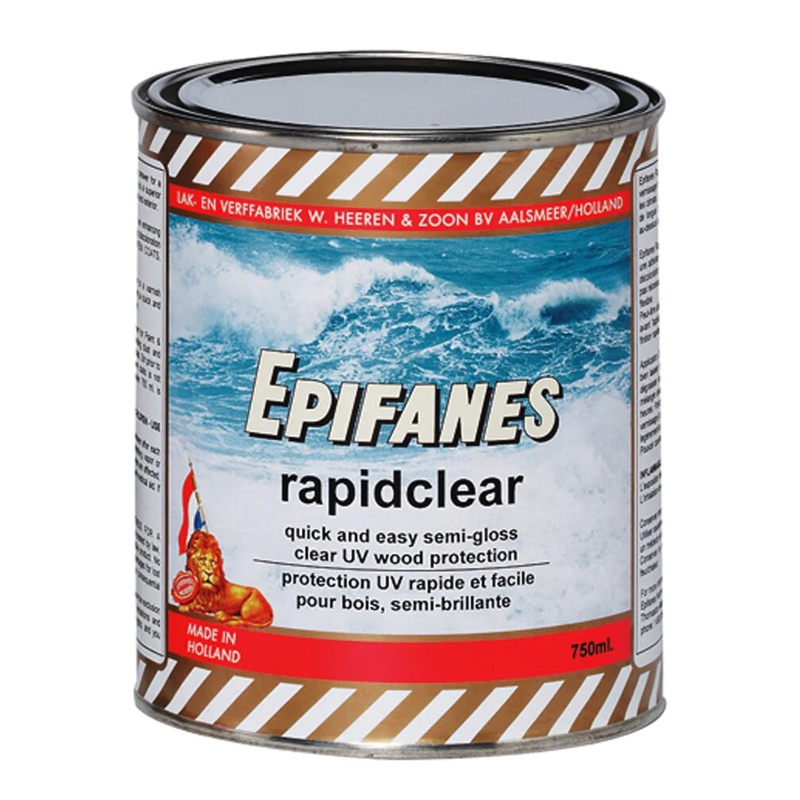 Epifanes Rapidclear Varnish is a quick and easy-to-apply semi-gloss wood finish with excellent UV filter properties. This oxidative drying urethane/alkyd base resin will create a full UV-resistant system on all interior and exterior woodwork above the waterline. Especially suited for teak. Rapidclear can also be sued as a quick-drying grain-filling coat before applying Epifanes Clear Gloss Varnish.