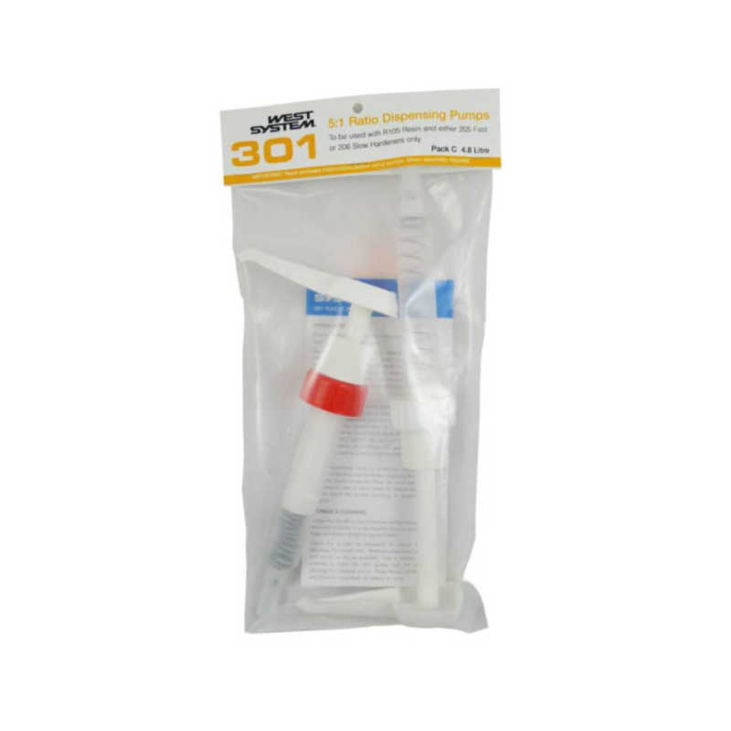301C (4.8ltr) 5:1 Ratio West System® Dispensing Pumps are to be used with 105 Resin and either 205 Fast or 206 Slow Hardeners only. West System® brand pumps mount directly onto 105 Resin 4 litre bottle and the 800 ml Hardener container. They are calibrated to dispense the correct ratio of resin and hardener with a single full stroke of each pump.