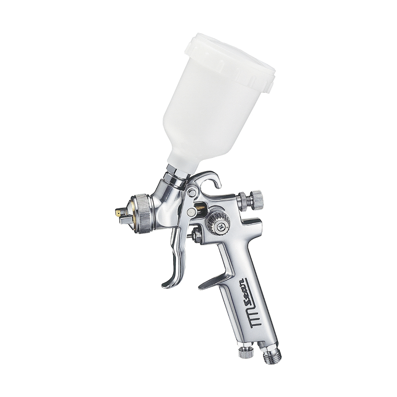 130ml Plastic Spray Pot, gravity-fed spray gun. Ideal for small touch-up spraying. Includes stainless steel needle & nozzle, adjustable air/fan and fluid control. Suitable for Automotive 2 Pak, Automotive Enamel, Basecoat, Polyurethane, Top Coat and Lacquer.