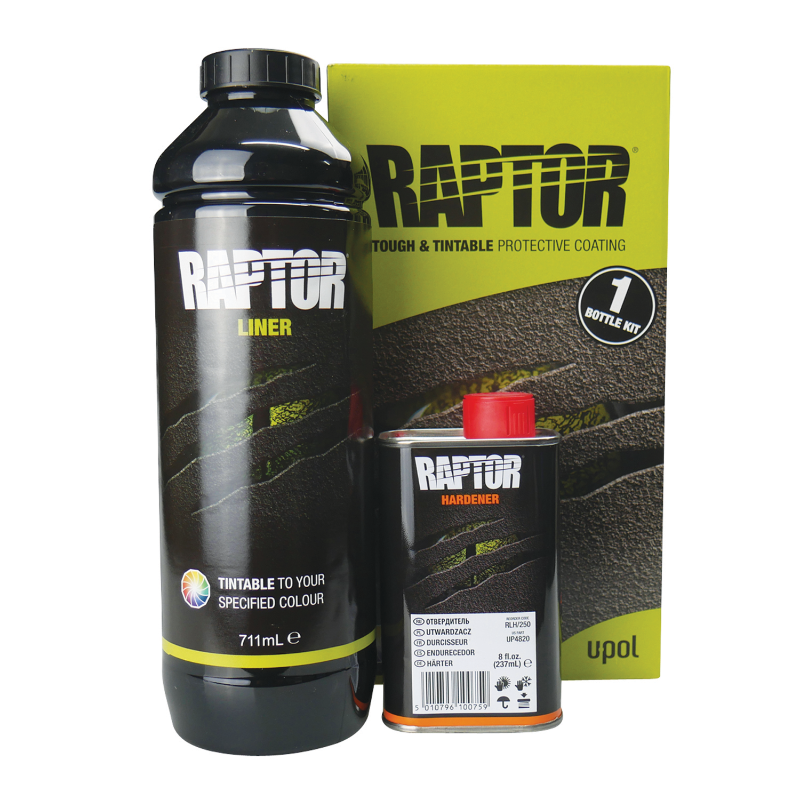 The 1 Bottle RAPTOR kit is ideal for smaller applications and touch-ups. Compatible with RAPTOR standard and professional vari-nozzle application guns. Each kit contains a bottle of RAPTOR and a tin of hardener in eye-catching retail packaging.