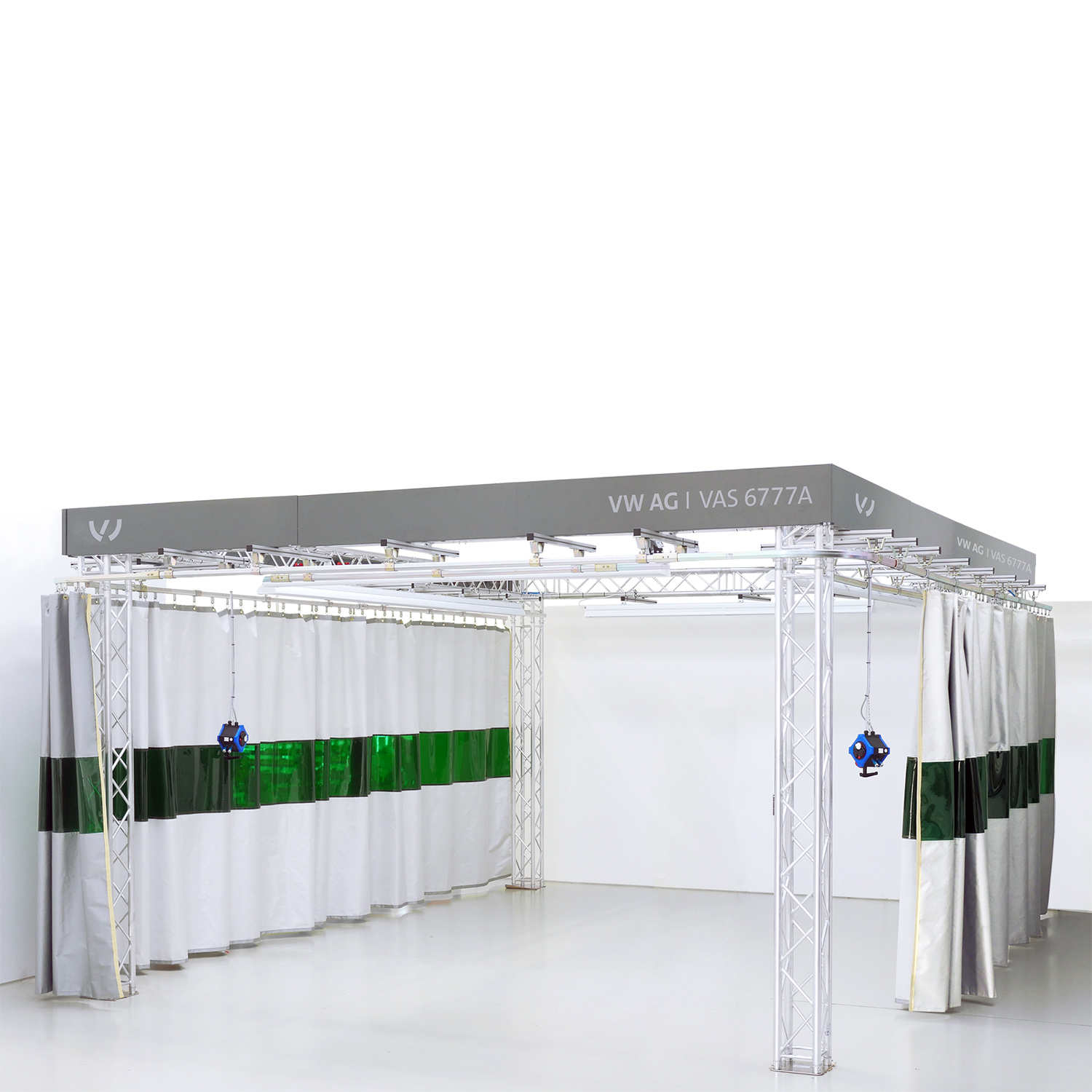 With our Body Shop Bay, you are ideally equipped for the repair of vehicles in mixed construction and can easily comply with safety requirements. The work area is separated from the surrounding area by a specially coated welding protection curtain. Thanks to the integrated green lamella, uninvolved people are optimally protected from the dangers of welding. The curtain and an LED light system are attached to a high-quality aluminum support system. The LED lighting system ensures optimum lighting conditions and is also characterized by high energy efficiency and robustness. The compressed air and energy supply is provided by two permanently installed, stationary media supply units with robust rubber housing.
