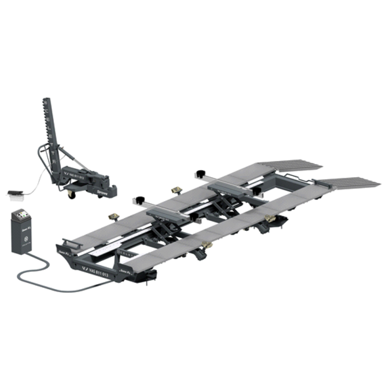 Alignment jig VAS 811 001/1: The alignment jig has a sturdy steel welded design with flat milled contact surfaces on which the modular traverses V.A.G 1392 are mounted. All current and future straightening brackets from all Volkswagen and Audi models as well as other car manufacturers can be installed on the modular traverses. With a quick fastening system, the wheel carriers and fastening clamps can be adjusted as required on the box profile of the alignment jig in next to no time.
