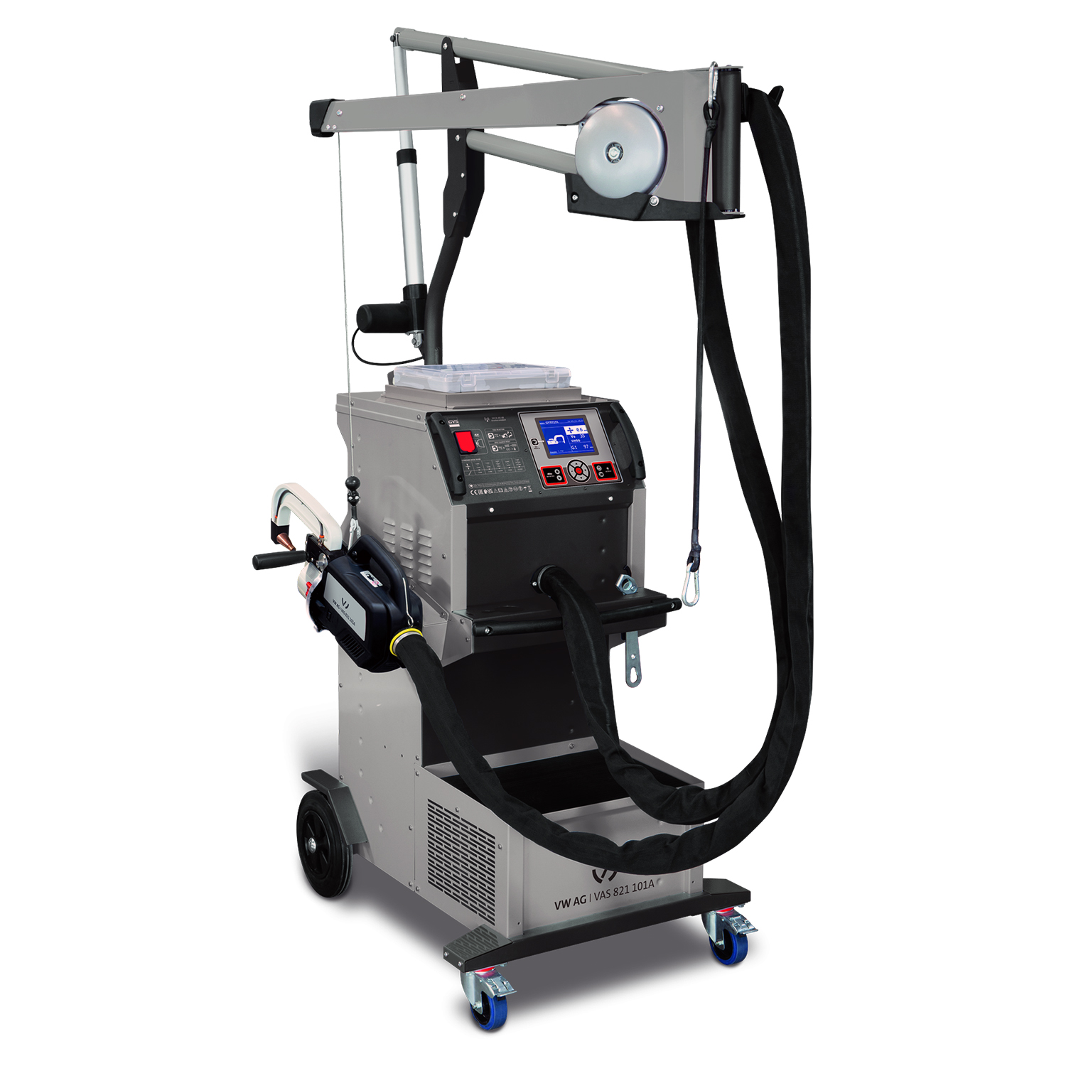 The VAS 821 101A processor-controlled multifunctional resistance welder with transformer G-clamp is suitable for all repair spot welds permitted on Volkswagen Group vehicles on high- and ultra-high-strength steel sheets and hot-tempered steel sheets (UHSS / Boron steel). It has a maximum electrode contact pressure of 550 daN at 8 bar and a welding power of up to 14,500 amperes.