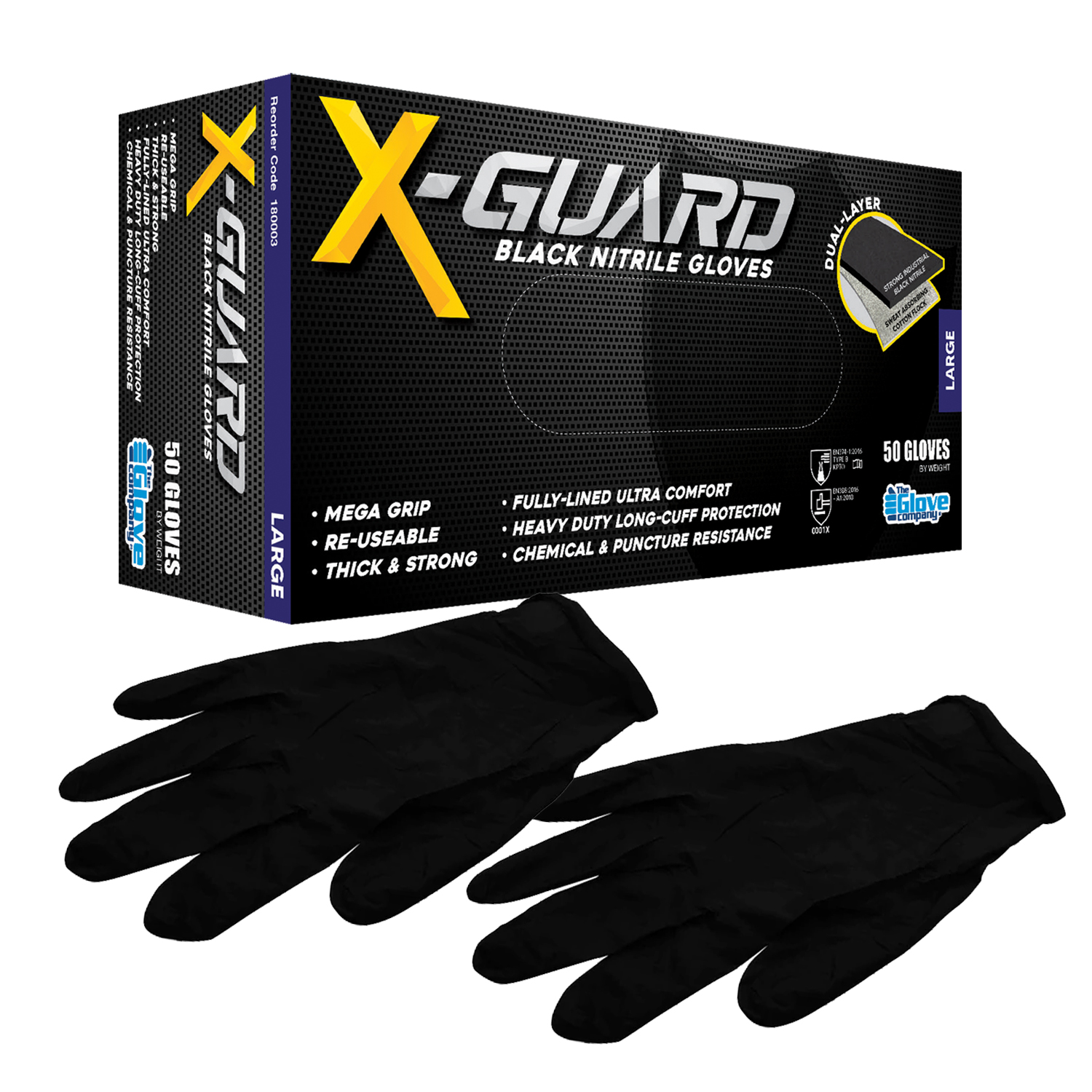 They feature a tough industrial-resistant black nitrile outer, and a soft sweat sweat-absorbing flock-lined inner to keep your hands cool and comfy while you work. Depending on the application that you are using them for, X-GUARD can be used as a disposable and/or a reusable glove. X-GUARD Black Nitrile Gloves offer increased protection against incidental chemical spills, as well as providing strong puncture and abrasion resistance. X-GUARD is suitable to withstand Petrol, Oils, Hydraulic Fluids, Diesel, Strong Cleaners, Chemicals, Acids, Alkalis, and many Solvents.*